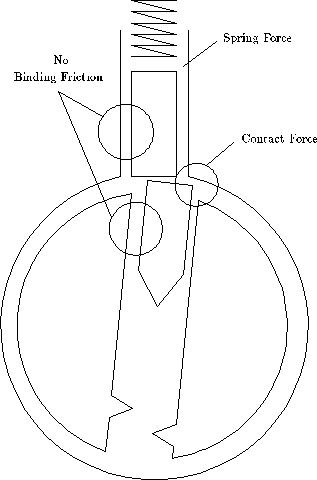 Chapter 5 The Pin Column Model The flatland model of locks can explain effects that involve more than one pin, but a different model is needed to explain the detailed behavior of a single pin. See Figure 5.1. The pin-column model highlights the relationship between the torque applied and the amount of force needed t lift each pin. IT is essential that you understand this relationship. In order to understand the "feel" of lock picking you need to know how the movement of a pin is effect by the torque applied by your torque wrench (tensioner) and the pressure applied by your pick. A good way to represent this understanding is a graph that shows the minimum pressure needed to move a pin as a function of how far the pin has been displaced from its initial position. The remainder of this chapter will derive that force graph from the pin-column model. Figure 5.2 shows a single pin position after torque has been applied to the plug. The forces acting of the driver pin are the friction from the sides, the spring contact force from above, and the contact force from the key pin below. The amount of pressure you apply to the pick determines the contact force from below. The spring force increases as the pins are pushed into the hull, but the increase is slight, so we will assume that the spring force is constant over the range of displacements we are interested in. The pins will not move unless you apply enough pressure to overcome the spring force. The binding friction is proportional to how hard the driver pin is being scissored between the plug and the hull, which in this case is proportional to the torque. The more torque you apply to the plug, the harder it will be to move the pins. To make a pin move, you need to apply a pressure that is greater than the sum of the spring and friction forces. When the bottom of the driver pin reaches the sheer line, the situation suddenly changes. See Figure 5.3. The friction binding force drops to zero and the plug rotates slightly (until some other pin binds). Now the only resistance to motion is the spring force. After the top of the key pin crosses the gap between the plug and the hull, a new contact force arises from the key pin striking the hull. This force can be quite large, and it causes a peak in the amount of pressure needed to move a pin. If the pins are pushed further into the hull, they key pin acquires a binding friction like the driver pin had in the initial situation. See Figure 5.4. Thus, the amount of pressure needed to move the pins before and after the sheer line is about the same. Increasing the torque increases the required pressure. At the sheer line, the pressure increases dramatically due to the key pin hitting the hill. This analysis is summarized graphically in figure 5.5.