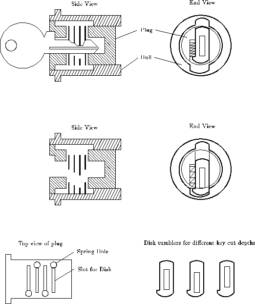 9.11 Driver or Spacer Enters Keyway Figure 9.9 shows how a spacer or driver pin can enter the keyway when the plug is rotated 180 degrees. You can prevent this by placing the flat side of your pick in the bottom of the keyway BEFORE you turn the plug too far. If a spacer or driver does enter the keyway and prevent you from turning the plug, use the flat side of your pick to push the spacer back into the hull. You may need to use the torque wrench to relieve any sheer force that is binding the spacer or driver. If that doesn't work try raking over the drivers with the pointed side of your pick. If a spacer falls into the keyway completely, the only option is to remove it. A hook shaped piece of spring steel works well for this, though a bent paper clip will work just as well unless the spacer becomes wedged. 9.12 Vibration Picking Vibration picking works by creating a large gap between the key and driver pins. The underlying principle is familiar to anyone who has played pool. When the queue ball strikes another ball squarely, the queue ball stops and the other ball heads off with the same speed and direction as the queue ball. Now imagine a device that kicks the tips of all the key pins. The key pins would transfer their momentum to the driver pins which would fly up into the hull. If you are applying a light torque when this happens, the plug will rotate when all the drivers are above the sheer line. 9.13 Disk Tumblers The inexpensive locks found on desks use metal disks instead of pins. Figure 9.10 shows the basic workings of these locks. the disks have the same outline but differ in the placement of the rectangular cut. These locks are easy to pick with the right tools. Because the disks are placed close together a half-round pick works better than a half-diamond pick (see Figure A.1). You may also need a torque wrench with a narrower head. Use moderate to heavy torque.