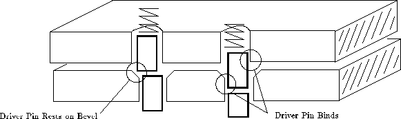9.8 Beveled Holes and Rounded pins Some lock manufacturers (e.g., Yale) bevel the edges of the plug holes and/or round off the ends of the key pins. This tends to reduce the wear on the lock and it can both help and hinder lock picking. You can recognize a lock with these features by the large give in set pins. See figure 9.4. that is, the distance between the height at which the driver pin catches on the edge of the plug hole and the height at which the driver pin catches on the edge of the plug hole and the height at which the key pin hits the hull is larger (sometimes as large as a sixteenth of an inch) when the plug holes are beveled or the pins are rounded. While the key pin is moving between those two heights, the only resistance to motion will be the force of the spring. There won't be any binding friction. This corresponds to the dip in the force graph shown in Figure 5.5 A lock with beveled plug holes requires more scrubbing to open than a lock without beveled holes because the driver pins set on the bevel instead of setting on the top of the plug. The plug will not turn if one of the drivers is caught on a bevel. The key pin must be scrubbed again to push the driver pin up and off the bevel. The left driver pin in Figure 9.6a is set. The driver is resting on the bevel, and the bottom plate has moved enough to allow the right driver to bind. Figure 9.6 shows what happens after the right driver pin sets. The bottom plate slides further to the right and now the left driver pin is scissored between the bevel and the top plate. It is caught on the bevel. To open the lock, the left driver pin must be pushed up above the bevel. Once that driver is free, the bottom plate can slide and the right driver may bind on its bevel. If you encounter a lock with beveled plug holes, and all the pins appear to be set but the lock is not opening, you should reduce torque and continue scrubbing over the pins. The reduced torque will make it easier to push the drivers off the bevels. If pins unset when you reduce the torque, try increasing the torque and picking pressure. The problem with increasing the force is that you may jam some key pins into the hull.