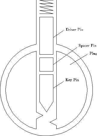 9.10 Master Keys Many applications require keys that open only a single lock and keys that opens group of locks. The keys that open a single lock are called _change keys_ and the keys that open multiple locks are called _master keys_. To allow both the change key and the master key to open the same lock, a locksmith adds an extra pin called a _spacer_ to some of the pin columns. See Figure 9.8. The effect of the spacer is to create two gaps in the pin column that could be lined up with the sheer line. Usually the change key aligns the top of the spacer with the sheer line, and the master key aligns the bottom of the spacer with the sheer line (the idea is to prevent people from filing down a change key to get a master key.) In either case the plug is free to rotate. In general, spacers make a lock easier to pick. They increase the number of opportunities to set each pin, and they make it more likely that the lock can by opened by setting all the pins at about the same height. In most cases only two or three positions will have spacers. You can recognize a position with a spacer by the two clicks you feel when the pin is pushed down. If the spacer has a smaller diameter than the driver and key pins, then you will feel a wise springy region because the spacer will not bind as it passes through the sheer line. It is more common for the spacer to be larger than the driver pin. You can recognize this by an increase in friction when the spacer passes through the sheer line. Since the spacer is larger than the driver pin, it will also catch better on the plug. If you push the spacer further into the hull, you will feel a strong click when the bottom of the spacer clears the sheer line. Thin spacers can cause serious problems. If you apply heavy torque and the plug has beveled holes, the spacer can twist and jam at the sheer line. It is also possible for the spacer to fall into the keyway if the plug is rotated 180 degrees. See section 9.11 for the solution to this problem.