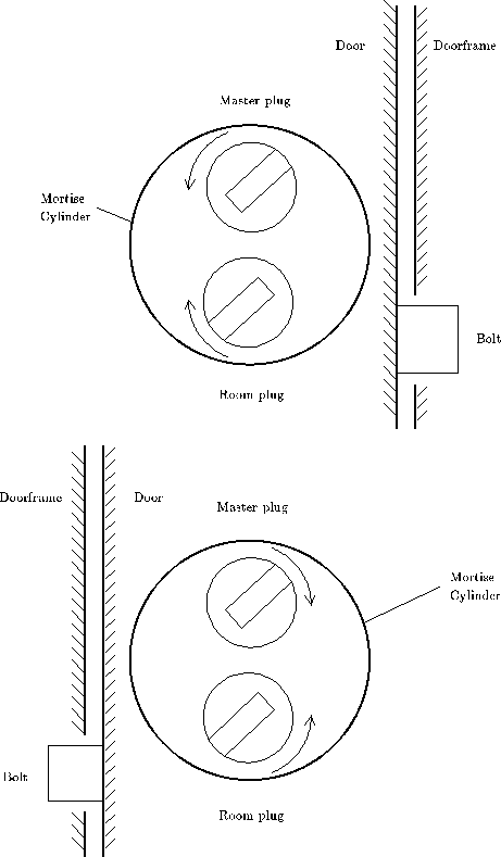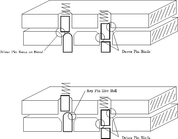 9.10 Master Keys Many applications require keys that open only a single lock and keys that opens group of locks. The keys that open a single lock are called _change keys_ and the keys that open multiple locks are called _master keys_. To allow both the change key and the master key to open the same lock, a locksmith adds an extra pin called a _spacer_ to some of the pin columns. See Figure 9.8. The effect of the spacer is to create two gaps in the pin column that could be lined up with the sheer line. Usually the change key aligns the top of the spacer with the sheer line, and the master key aligns the bottom of the spacer with the sheer line (the idea is to prevent people from filing down a change key to get a master key.) In either case the plug is free to rotate. In general, spacers make a lock easier to pick. They increase the number of opportunities to set each pin, and they make it more likely that the lock can by opened by setting all the pins at about the same height. In most cases only two or three positions will have spacers. You can recognize a position with a spacer by the two clicks you feel when the pin is pushed down. If the spacer has a smaller diameter than the driver and key pins, then you will feel a wise springy region because the spacer will not bind as it passes through the sheer line. It is more common for the spacer to be larger than the driver pin. You can recognize this by an increase in friction when the spacer passes through the sheer line. Since the spacer is larger than the driver pin, it will also catch better on the plug. If you push the spacer further into the hull, you will feel a strong click when the bottom of the spacer clears the sheer line. Thin spacers can cause serious problems. If you apply heavy torque and the plug has beveled holes, the spacer can twist and jam at the sheer line. It is also possible for the spacer to fall into the keyway if the plug is rotated 180 degrees. See section 9.11 for the solution to this problem.